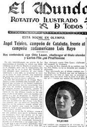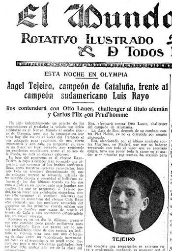| Keywords: TEJEIRO RAYO.jpg  en Newspaper cutting Mundo Deportivo june 10 1927 p1 fight between Angel Tejeiro and Luis Rayo es Recorte de periódico Mundo Deportivo 10 junio 1927 p1 combate entre Angel Tejeiro y luis Rayo own Tejeirosalguero2 1927 Boxing in Spain 1927 |
