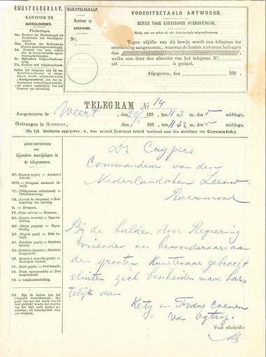 | Keywords: Telegram sent by Frans Coenen van Ogtrop to Pierre Cuypers on occasion of his 70th birthday.jpg Artwork Kety “ and Frans Coenen van Ogtrop “1902 1897-05-20 pencil blue printed matter cm 26 7 19 8 Institution Cuypershuis place of discovery object history exhibition history credit line Dr Cuypers / Commandeur van den / Nederlandschen Leeuw / Roermond / Bij de hulde door Regeering / vrienden en bewonderaars aan / den grooten Kunstenaar gebracht / sluiten zich bescheiden maar har- / telijk aan / Kety en Frans Coenen / van Ogtrop accession number 0387 z place of creation Roermond museumcollecties roermond nl http //museumcollecties roermond nl/adlib/search/simple Home http //museumcollecties roermond nl/adlib/Details/cuypershuis/603 Info http //museumcollecties roermond nl/adlib-wwwopacx/wwwopac ashx command getcontent server images value 0387z-1 jpg Pic http //museumcollecties roermond nl/adlib/Details/cuypershuis/603 Collectie Online Gemeente Roermond i18n/as diversen Telegrammen b g v 70e verjaardag van P J H Cuypers PD-old-100 Members of the Senate of the Netherlands Collections of the Cuypershuis Pierre Cuypers Telegrams of the Netherlands |