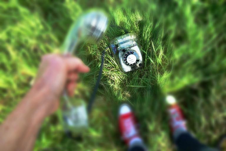 Keywords: telephone vintage analog technology communication receiver dial dialling cable cord hand lifting the receiver answering a call