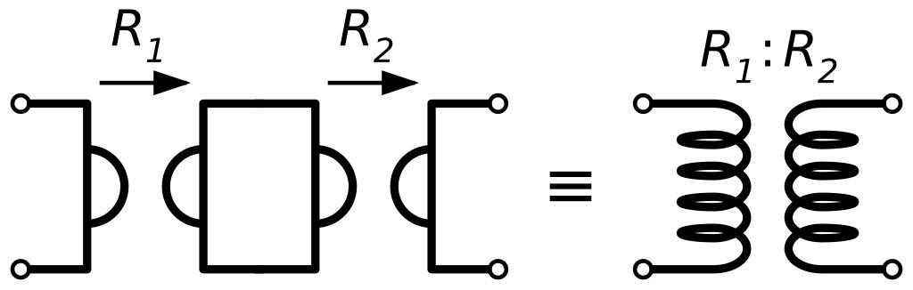 Keywords: Tellegen-gyrator-cascaded.svg handSVG ValidSVG en Two cascaded gyrators - equivalent to an ideal transformer of turns-ratio equal to the ratio of the gyration resistances own Catslash 2010-05-11 Gyrators Valid SVG