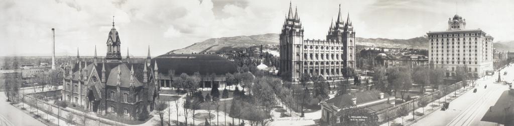 | Keywords: Temple Square 1912 panorama.jpg Panoramic photo of w Temple Square The photo is taken from South Temple Street between Main and West Temple From left to right are the Salt Lake Assembly Hall the Salt Lake Tabernacle the dark roofed domed structure behind the Hall the Salt Lake Temple and Hotel Utah is on the far right Hotel Utah is now the Joseph Smith Memorial Building LOC-image pan 6a10553 1912 L Hollard File Mormon Temple grounds LCCN2007662832 tif PD-old Black and white panoramic photographs of cities Joseph Smith Memorial Building Temple Square 1912 in Utah Utah skylines |