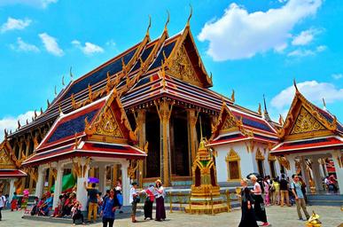 Keywords: temple wat church architecture culture people tourist buddha emerald sky thai cloud yellow blue gold perspective white ground thailand architectural colorful religious siam heritage buidling buddhism asia ancient bright sunny day daylight day