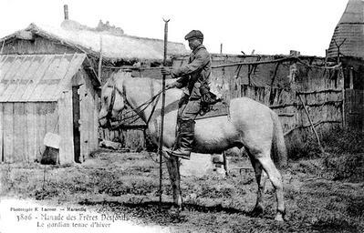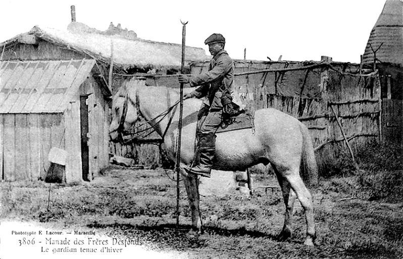 Keywords: Tenue de gardian.jpg Gardian en tenue d'hiver à la manade des frères Desfonds en Camargue France / A herdsman in winter attire at the Desfonds brothers' cattle farm in the Camargue region France Carte postale de l'âge d'or début XXe siècle / Vintage postcard early 20th century Début XXe siècle / Early 20th century E Lacour Marseille Domaine public / Public Domain Aucune / None PD-old Gardian Camargue horse Postcards of Camargue Regional clothing in Camargue Manade Old postcard of Port-Saint-Louis-du-Rhône Horse riding in France Cabanes de gardian Peasants in early 20th century |