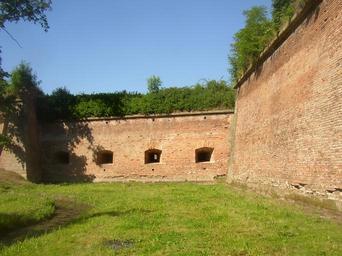 Keywords: Terezin CZ fortification artillery casemates 032.jpg Detail opevnění na západním okraji terezínské pevnosti Dělostřelecká kasemata kryjící pravý bok ravelinu XVIII Wpravo patrná eskarpa ravelinu cihlové zdivo v nároží posíleno kamennými kvádry vlevo na dně příkopu probíhá zavodněná kyneta A small example of extensive fortification of Terezín in this instance from western side of the fortress Artillery casemates providing cover to the right flank of Ravelin XVIII as seen from bottom of the moat the escarpe of the ravelin is visible in the right 50 30 42 N 14 08 35 E type landmark_region CZ Fortification of Terezín Fortress Casemates Ravelins |