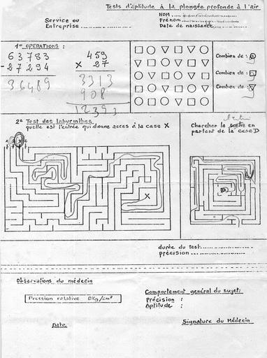 | Keywords: Test psycho-technique.jpg fr Test psycho-technique d'aptitude à la plongée professionnelle en caisson hyperbare à -70 m recherche de signes indirects d'ivresse des profondeurs cogner les murs du labyrinthe est de mauvais augure 2015-10-02 16 21 30 own Royonx other versions cc-zero Decompression diving Uploaded with UploadWizard Uploaded with UploadWizard Nitrogen Nitrogen narcosis | ||||