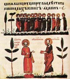 | Keywords: Tetraevangelia of Ivan Alexander 06.png en John the Evangelist and Ivan Alexander - Miniature from Tetraevangelia of Ivan Alexander bg Йоан Богослов и Иван Александъ - иниатю а от Четве оевангелието на ца Иван Александъл Исто ия на Бълга ия Том ІІІ Вто а бълга ска дъ жава издателство на БА София 1982 author 1355-1356 Ivan Alexander of Bulgaria Tetraevangelia of Tsar Ivan Alexander 1355-1356 - BL Add MS 39627 PD-old-100 | ||||