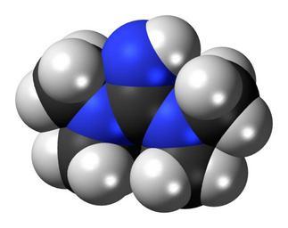 | Keywords: Tetramethylguanidine-3D-spacefill.png Space-filling model of the tetramethylguanidine molecule a strong organic base Colour code 505050 Carbon C black<br> F0F0F0 Hydrogen H white<br> 3C50FA Nitrogen N blue<br> 2011-02-02 own DS Visualizer Jynto talk Ball-and-stick version cc-zero Guanidines Methyl compounds Images by Jynto |