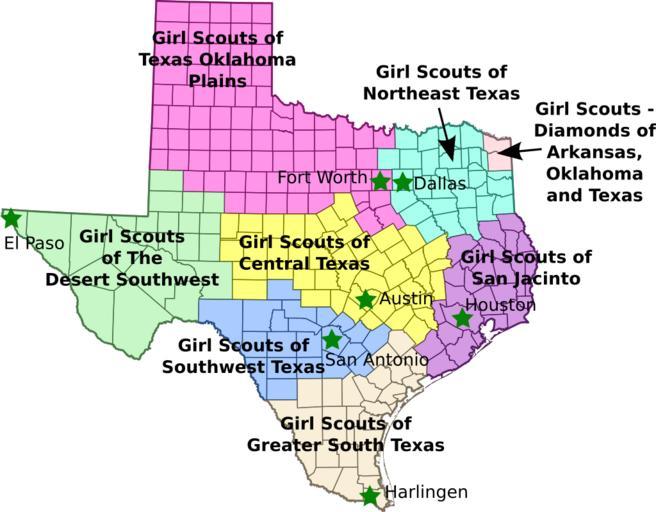 | Keywords: Texas-gsusa.svg Map of Girl Scout Councils in Texas own <br> Based on the Wikipedia county maps 2009-02-06 Emma Pease en English Wikipedia Erp Emma Pease Original upload log en wikipedia Michael Barera CommonsHelper en wikipedia Texas-gsusa svg 2009-06-16 02 59 Erp 15188×11855× 688124 bytes <nowiki>Updated to reflect council merger</nowiki> 2009-02-07 03 52 Erp 15188×11855× 690881 bytes <nowiki> Map of Girl Scout Councils in Texas my work based on wikipedia county map 2009-02-06 Emma Pease </nowiki> Girl Scouts of the USA Council maps Maps of Texas SVG maps in English Scouting in Texas Regions of Texas |