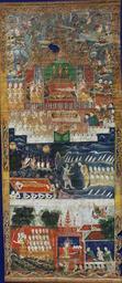 | Keywords: Thai - Death of Buddha, and Other Events - Walters 20101229.jpg Events in the painting are as follows 1 The Buddha's last meal at Cunda's home 2 Buddha is led to a forest of Sal trees belonging to the King of Mallas at Kusinara 3 The Buddha's Parinibbana 4 Kassapa Hears About The Passing Away of the Buddha 5 Kassapa at Buddha's Pyre century 19 pigments cloth cm 185 5 94 accession number 2010 12 29 81933 Ethnic East Regent Hotel Mae Rim Old Road Chiengmai Thailand Collection of James E Bogle Philadelphia Pennsylvania December 10 2002 by purchase Walters Art Museum Gift of Mr James E Bogle 2010 place of origin Thailand Walters Art Museum license 2D Thai paintings in the Walters Art Museum Art of Ancient Thailand Media contributed by the Walters Art Museum needs category review Buddhist art from Thailand |