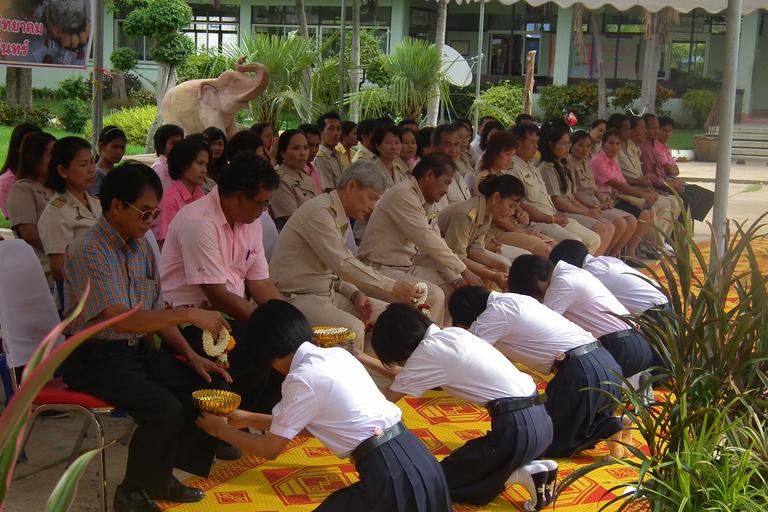 Keywords: thailand men women offering ceremony faith religion military kneeling outside