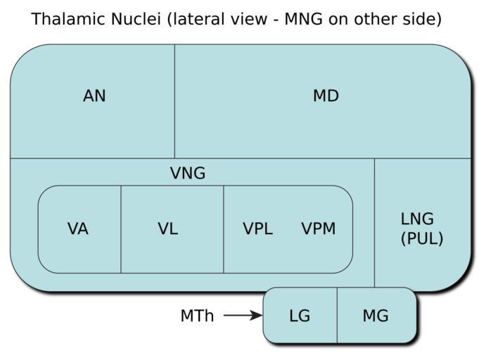 | Keywords: ThalamicNuclei.svg Thalamic nuclei MNG Midline nuclear group AN Anterior nuclear group MD Medial dorsal nucleus VNG Ventral nuclear group VA Ventral anterior nucleus VL Ventral lateral nucleus VPL Ventral posterolateral nucleus VPM Ventral posteromedial nucleus LNG Lateral nuclear group PUL Pulvinar MTh Metathalamus LG Lateral geniculate nucleus MG Medial geniculate nucleus ThalamicNuclei png 50 2012-01-22 06 39 UTC ThalamicNuclei png Arcadian derivative work Hazmat2 <span class signature-talk >talk</span> Translate Arcadian Lateral geniculate nucleus Medial geniculate nucleus Thalamus |