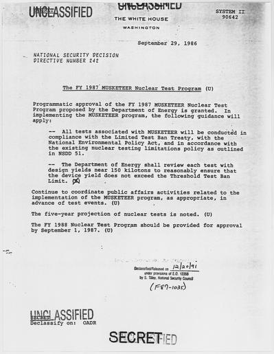 | Keywords: The 1987 MUSKETEER Nuclear Test Program - NARA - 198344.tif Scope and content General notes 198344 Local identifier President 1981-1989 Reagan National Security Council 1981 - 1989 Ronald Reagan Library NLRR 40 Presidential Drive Simi Valley CA 93065-0600 1986-09-29 Record group Collection RR-NSC Numbered National Security Policy Papers 1981 - 1989 Record group ARC 1189 National Security Decision Directives compiled 02/25/1981 - 01/19/1989 Series ARC 198166 File unit File unit ARC Variant control numbers NAIL Control Number NLS-NSC-NSDD-242 yes Other versions <gallery> File The_1987_MUSKETEER_Nuclear_Test_Program_-_NARA_-_198344 tif tif File The_1987_MUSKETEER_Nuclear_Test_Program_-_NARA_-_198344 jpg jpg </gallery> NARA-cooperation PD-USGov Operation Musketeer nuclear test Presidential Decision Directives Reagan NARA TIF images with categorized JPGs |