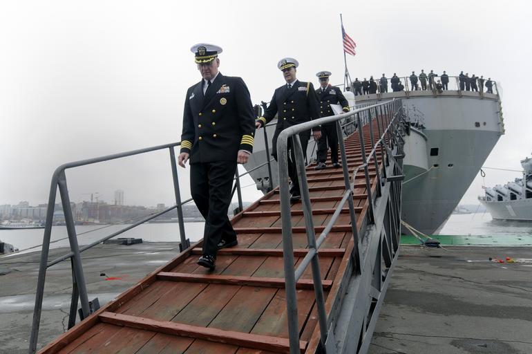 | Keywords: The 65th anniversary of Victory Day DVIDS276820.jpg en Capt Rudy Lupton commanding officer of the U S 7th Fleet command ship USS Blue Ridge disembarks the ship as it arrives to Vladivostok Russia Blue Ridge Sailors will be engaged in a number of community outreach events in Vladivostok and will march with members of the Russian military during a parade to commemorate the 65th anniversary of Victory Day a national holiday in Russia 2010-05-07 Petty Officer 3rd Class Daniel Viramontes https //www dvidshub net/image/276820 100507-N-+++++-339 2010-05-08 01 43 VLADIVOSTOK RU PD-USGov-Military-Navy USS Blue Ridge LCC-19 Images from DoD uploaded by Fæ |