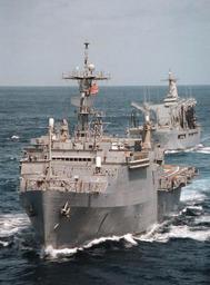 Keywords: 960717-N-9975P-001 Amphibious Operations at Sea.jpg en 960717-N-9975P-001 The Amphibious transport ship USS Trenton LPD 14 forward and the fleet oiler USS Merrimack AO 179 rear cut through the waters of the Atlantic Ocean July 17 1996 Both ships are part of the carrier USS George Washington CVN 73 Battle Group The George Washington battle group will be returning to homeport July 23rd after completing a scheduled six-month deployment to the Mediterranean which included sustained operations in support of the NATO-led peacekeeping in Bosnia and UN sanctions against Iraq in the Arabian Gulf U S Navy photo by Photographer's Mate 1st Class Air Warfare Greg Pinkley Released 960717-N-9975P-001 Navy http //www navy mil/view_image asp id 417 U S Navy photo by Photographer's Mate 1st Class Air Warfare Greg Pinkley PD-USGov-Military-Navy USS Trenton LPD-14 |