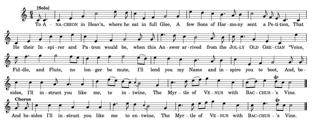 | Keywords: The Anacreontic Song (corrected version).png en Melody of The Anacreontic Song from the first Longman Broderip edition c 1780 Transcribed and typeset in Lilypond by the uploader 1780 http //lcweb2 loc gov/diglib/ihas/loc natlib ihas 100000012/default html Ralph Tomlinson / Anon John Stafford Smith other versions Generated from the following Lilypond source with the command <code>lilypond anacr ly</code> <pre> version 2 18 2 set-default-paper-size a4 'landscape myMelody c8 \markup \bold Solo c4 c4 e4 g4 c2 e8 d8 c4 e 4 f4 g2 g4 e'4 d4 c4 b4 a8 b4 c2 g8 f8 e8 c4 c4 \break c4 e4 g4 c4 c4 e4 c4 e 4 f4 g2 g8 g8 e'4 d8 c4 b2 a8 b8 c8 c4 g4 e4 c4 e'4 \break e8 f4 g4 g2 f8 e8 d4 e4 f4 f2 e8 d8 e4 d4 c4 b4 a8 b4 c4 e 4 f4 g2 g8 g8 \break c4 c4 c4 a8 a4 a4 d4 f8 e8 d8 c8 \appoggiatura c4 b2 g4 c4 d8 e8 f8 g4 e4 c4 c8 d8 e4 d8\trill c8 c2 \bar \break g8 \markup \bold Chorus g8 c4 c4 c4 a4 a4 a4 d4 e8 d4 \appoggiatura c4 b2 g4 c4 d8 e8 f8 g4 e4 c4 c8 e4 d8\trill c8 c2 \bar myLyrics \lyricmode To \markup\smallCaps A -- \markup\smallCaps na -- \markup\smallCaps creon in Heav'n where he sat in full Glee A few Sons of Har -- mo -- ny sent a Pe -- ti -- tion That He their In -- spi -- rer and Pa -- tron would be when this An -- swer ar -- rived from the \markup\smallCaps Jol -- \markup\smallCaps ly \markup\smallCaps Old \markup\smallCaps Gre -- \markup\smallCaps cian Voice Fid -- dle and Flute no lon -- ger be mute I'll lend you my Name and in -- spire you to boot And be -- sides I'll in -- struct you like me to in -- twine The Myr -- tle of \markup\smallCaps Ve -- \markup\smallCaps nus with \markup\smallCaps Bac -- \markup\smallCaps chus -- 's Vine And be -- sides I'll in -- struct you like me to en -- twine The Myr -- tle of \markup\smallCaps Ve -- \markup\smallCaps nus with \markup\smallCaps Bac -- \markup\smallCaps chus -- 's Vine PUTTING IT ALL TOGETHER anacrMelody \autoBeamOff \time 6/4 \key c \major \partial 2 \relative c' \myMelody anacrLyrics \set associatedVoice anacrMelody \myLyrics allMelody \new Voice melody \anacrMelody allLyrics \new Lyrics \lyricsto melody \anacrLyrics anacrStaff \new Staff << \allMelody \allLyrics >> disableBarNumbers \context Score \applyContext set-bar-number-visibility 1000 anacrScore \score << \disableBarNumbers \anacrStaff >> anacrBook \book \header tagline remove footer \anacrScore \anacrBook END </pre> PD-old-100-1923 Uploaded with UploadWizard To Anacreon in Heaven |