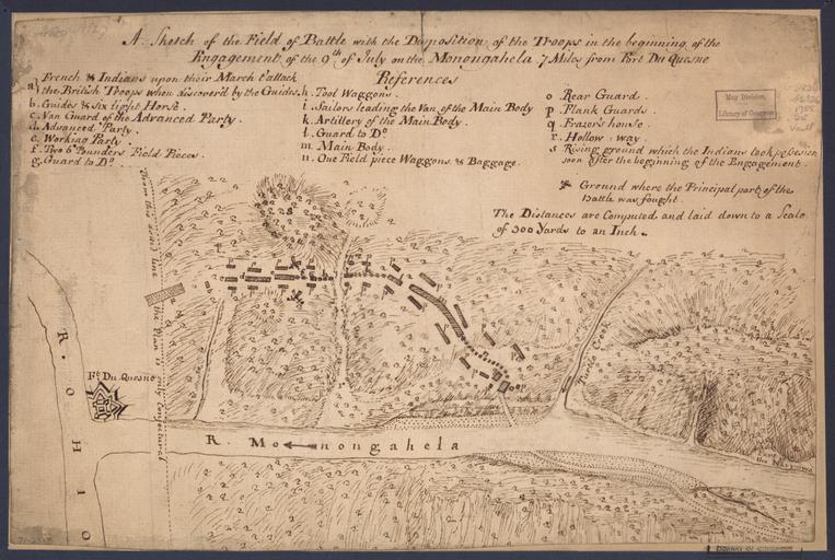 | Keywords: The Battle of the Monongahela WDL9580.png Artwork ru Битва п и ононгахеле fr La bataille de la Monongahéla en The Battle of the Monongahela zh 莫 加希拉战役 pt A Batalha de Monongahela ar معركة مونوغاهيلا ru а этой укописной выполненной пе ом и тушью ка те показано асположение войск в начале битвы п и ононгахеле кото ая п оизошла 9 июля 1755 г во вто ой год Войны с ф анцузами и индейцами аме еваясь изгнать ф анцузов из западной части Пенсильвании б итанцы отп авили войска численностью 2 000 человек состоящие из егуля ной а мии и колониальной милиции под командованием гене ала Эдва да Б эддока для захвата фо та Дюкень асположенного у места слияния ек Аллегейни и ононгахелы там где в настоящее в емя находится цент Питтсбу га После т удного ма ша че ез севе ную часть Ви джинии и западную часть э иленда Б эддок пове нул на севе в Пенсильванию 9 июля Б эддок и колонна из 1 300 человек пе есекли еку ононгахелу и начали двигаться в нап авлении к фо ту п име но десять миль 16 километ ов вниз по течению Они подве глись нападению небольшого от яда ф анцузских солдат и нескольких сотен индейцев-союзников включая индейцев оттава майами гу онов делавэ ов шауни и и окезов Б итанцы поте пели сок ушительное по ажение п иблизительно 500 солдат включая самого Б эддока были убиты и более 450 анены С еди уцелевших был полковник Джо дж Вашингтон адъютант Б эддока и команди полка Ви джинии <br>Река Аллегейни штаты Пенсильвания и ью-Йо к ; Поля с ажений; С ажения; Великоб итания Колонии; Долина еки ононгахелы штаты Западная Ви джиния и Пенсильвания ; ононгахела битва п и Пенсильвания 1755 г ; Река Огайо; Регион Питтсбу г штат Пенсильвания ; Соединенные Штаты Аме ики Исто ия Война с ф анцузами и индейцами 1754-1763 гг fr Cette carte manuscrite à la plume et à l'encre montre l'emplacement des troupes au début de la bataille de la Monongahéla qui eut lieu le 9 juillet 1755 durant la deuxième année de la guerre de la Conquête Déterminés à chasser les Français de Pennsylvanie occidentale les Britanniques avaient envoyé une force composée de 2 000 hommes de l'armée régulière et de la milice coloniale Sous les ordres du général Edward Braddock ces troupes cherchaient à capturer fort Duquesne situé au confluent des rivières Allegheny et Monongahéla dans ce qui est aujourd'hui le centre de Pittsburgh Après une marche très difficile à travers la Virginie du Nord et le Maryland occidental Braddock se dirigea au nord vers la Pennsylvanie Le 9 juillet Braddock et une colonne de 1 300 hommes traversèrent la Monongahéla et se dirigèrent se dirigèrent vers le fort à quelque 16 kilomètres en aval Ils furent attaqués par un petit détachement de soldats français et plusieurs centaines d'alliés indiens notamment des Ottawas Miamis Hurons Delawares Shawnees et Iroquois Les Britanniques essuyèrent une défaite désastreuse environ 500 soldats dont Braddock lui-même furent tués et plus de 450 blessés Parmi les survivants on comptait le colonel George Washington assistant de Braddock et commandant du régiment de Virginie <br>Rivière Allegheny Pennsylvanie et New York ; Champs de bataille; Batailles; Grande-Bretagne--Colonies; Vallée de la rivière Monongahéla Virginie-Occidentale et Pennsylvanie ; Monongahéla Bataille de la en Pennsylvanie 1755; Rivière Ohio; Région de Pittsburgh Pennsylvanie ; États-Unis - Histoire - Guerre de la Conquête 1754-1763 en This manuscript pen-and-ink map shows the disposition of troops at the beginning of the Battle of Monongahela which took place on July 9 1755 in the second year of the French and Indian War Determined to drive the French out of western Pennsylvania the British had sent a force of 2 000 army regulars and colonial militia commanded by General Edward Braddock to capture Fort Duquesne located at the confluence of the Allegheny and Monongahela rivers in what is now downtown Pittsburgh After an arduous march through northern Virginia and western Maryland Braddock turned north into Pennsylvania On July 9 Braddock and a column of 1 300 men crossed the Monongahela River and began heading toward the fort some ten miles 16 kilometers downstream They were attacked by a small detachment of French soldiers and several hundred Indian allies including Ottawas Miamis Hurons Delawares Shawnees and Iroquois The British suffered a disastrous defeat approximately 500 soldiers including Braddock himself were killed and more than 450 were wounded Among the survivors was Colonel George Washington an aide to Braddock and commander of the Virginia Regiment <br>Allegheny River Pennsylvania and New York ; Battlefields; Battles; Great Britain--Colonies; Monongahela River Valley West Virginia and Pennsylvania ; Monongahela Battle of the Pennsylvani