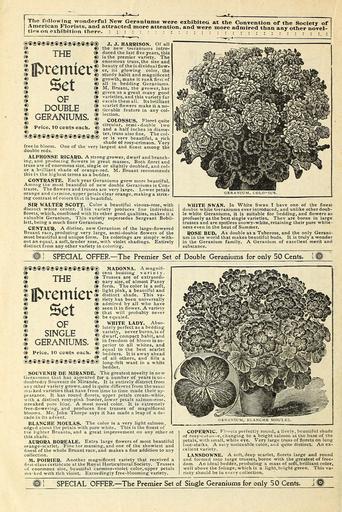 | Keywords: The best homes in America plant my flowers, why not you? (16363371956).jpg - s- <br> - £ <br> The following wonderful New Geraniums were exhibited at the Convention of the Society of <br> American Florists and attracted more attention and were more admired than any other novel- <br> ties on exhibition there ; <br> « i w <br> ®«\8/8\8/e\8/i <br> THE <br> premier <br> Set <br> OF <br> ¢ <br> DOUBLE <br> GERANIUMS <br> Price 10 cents each <br> J J HARRISON Of all <br> the new Geraniums intro- <br> duced the last five years this <br> is the premier vanety The <br> enormous truss the size and <br> beauty of their dividualflow- <br> er its plowing color the <br> sturdy habit and magnificent <br> growth make it rank first of <br> all in bedding Geraniums <br> M Bruanl the grower has <br> given us a great many good <br> varieties and this variety far <br> excels them all Its brilliant <br> scarlet flowers make it a no- <br> ticeable feature in any col- <br> lection <br> COLOSSUS Floret quite <br> circular semi -double two <br> and a half inches in diame- <br> ter truss also fine The col- <br> or is very beautiful a rich <br> shade of rosy-crimson Very <br> reein bloom One of the very largest and finest among the <br> double reds <br> ALPHONSE RICARD A strong grower dwarf and branch- <br> ing and producing flowers in great masses Both floret and <br> truss are of enormous size single or sliehtly doubled and col- <br> or a brilliant shade of orange-red M Bruant recommends <br> this in the highest terms as a bedder <br> CONTRASTE Kach year Geraniums grow more beautiful <br> Among the most beautiful of new double Geraniums is Con- <br> traste The flowers and trusses are very large Lower petals <br> orange and carmine upper petals clear orange making a strik- <br> ing contrast of colors that is beautiful <br> SIR WALTER SCOTT Color a beautiful vinous-rose with <br> distinct white center This variety produces fine individual <br> florets which combined with its other good qualities makes it a <br> valuable Geranium This variety supersedes Sergeant Bobil- <br> lett being a much finer Geranium <br> CENTAUR A distinci new Geranium of the large-flowered <br> Bruant race producing very large semi-double flowers of the <br> most beautiful and unique form Its colorings are simply with- <br> out an equal a soft tender rose with violet shadings Entirely <br> distinct from any other variety in coloring <br> WHITE SWAN In White Swan I have one of the finest <br> double white Geraniums ever introduced and unlike other doub- <br> le white Geraniums it is suitable for bedding and flowers as <br> profusely as the best single varieties They are borne in large <br> trusses and are spotless snowy-white retaining their pure white- <br> ness even in the heat of Summer <br> ROSE BUD As double as a Tuberose and the only Gerani- <br> um in the world that makes beautiful buds It is truly a wonder <br> in the Geranium family A Geranium of excellent merit and <br> substance <br> <br> SPECIAL OFFER ” The Premier Set of Double Geraniums for only 50 Cents <br> MADONNA A magnifi- <br> cent bedaing variety <br> Trusses are of extraordi- <br> nary size of almost Pansy <br> _ form The color is a soft <br> fff – v-c-v- At light pink a beautiful and <br> IIOLI-ITIIkIL distinct shade This va- <br> il ¢ ' ' Vr' V o riety has been universally <br> ¢ admired by all who have <br> ¢ seen it in flower A variety <br> i that will probably never <br> ¢ be equaled <br> 2 WHITE LADY Abso- <br> 9 lutely perfect as a bedding <br> variety never burns is of <br> 9 dwarf compact habit and <br> in freedom of bloom is su- <br> - perior to all whites and <br> equal to the best scarlet <br> J bedders It is away ahead <br> Set <br> OF <br> SINGLE <br> GERANIUMS <br> Price 10 cents each <br> - - - - °f a others and fill <br> long-felt want in ; <br> white <br> bedder <br> SOUVENIR DE MIRANDE The greatest novelty in new <br> Geraniums that has appeared for a number of years is un- <br> doubtedly Souvenir de Mirande It is entirely distinct from <br> any other variety grown and is quite different from theusual <br> inn ked varieties that have from time to time made their ap- <br> pearance It has round florets upper petals cream-white <br> with a distinct rosy-pink border lower petals salmon-rose <br> streaked pure lilac A most novel color It is extremelv <br> free-flowering and produces fine trusses of magnificent <br> blooms Mr John Thorpe says it has made a leap of a de- <br> cade in its advent <br> BLANCHE MOULAS The color is a very light salmon <br> edged about the petals with pure white This is the finest of <br> trie lighter Bruants and a great improvement on any other ot <br> this shade <br> AURORA BOREALE Extra large flowers of most beautiful <br> orange-scarlet Fine tor massing and one of the showiest and <br> finest of the whole Bruant race and makes a fine addition to any <br> collection <br> M POIRIER Another magnificent variety that received a <br> first-class certificate at the Royal Horticultural Society Trusses <br> of enormous size beautiful carmine-violet color upper petals <br> ma' ked with rich violet Exceedingly free-blooming variety <br> GERANIUM BLANCHE MOULAS <br> COPERNIC Florets perfectly round a lively beautiful shade <br> of rosy-caruiiue changing to a bright salmon at the base of the <br> petals with small white eye Very large truss of florets on long <br> foot-stalks A veiy noticeable color and quite distinct An ex- <br> cellent variety <br> LANSDOWNE A soft deep scarlet florets large and round <br> and formed into large trusses borne with the greatest of free- <br> dom An ideal bedder producing a mass of soft brilliant color <br> well above the foliage which is a light bright green This va- <br> riety should be in every collection <br> – S <br> SPECIAL OFFER ” The Premier Set of Single Geraniums for only 50 Cents 41846983 130961 64578 Text http //www biodiversitylibrary org/page/41846983 1899 10 5962/