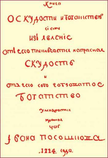 | Keywords: The book about scantiness and wealth.jpg en The title page of The book about scantiness and wealth by I T Pososhkov ru Заглавная ст аница Книги о скудости и богатстве И Т Посошкова http //www krotov info/pictures/books/chernyh/pososh jpg Author 1724 PD-old-100 Title pages from Russia PD-old-100 |
