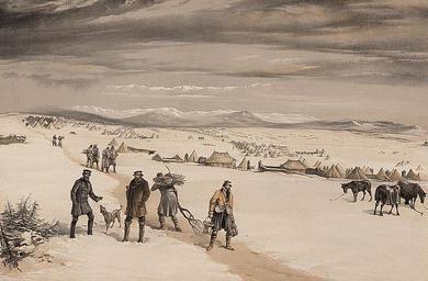 Keywords: The camp of the second division, looking east January 1855.jpg Artwork en Print shows men on a roadway horses tethered on the right and a distant view of the tents of the 2nd Division during winter W Simpson; lith 38 4 x 57 1 print lithograph tinted accession number LC-DIG-ppmsca-05688 digital file from original print Institution Library of Congress ppmsca 05688 Rights Advisory No known restrictions on publication <gallery> </gallery> Title from item Plate in The seat of war in the east Dedicated by permission to Her most gracious Majesty the Queen / William Simpson First series London Published by Paul Dominic Colnaghi Co publishers to Her Majesty 13 14 Pall Mall East ; Paris Goupil Cie 1855 plate 25 Colnaghis' authentic series PD-100 William Simpson Uploaded with UploadWizard |