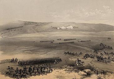 Keywords: The cavalry affair of the heights of Bulganak - the first gun, 19th Sepr. 1854.jpg Artwork en Print shows expansive view of the countryside the Russian cavalry and artillery in the distance Russian guns opening fire on British troops as they draw up into formation W Simpson del ; Needham lith 38 4 x 57 1 print lithograph tinted accession number LC-DIG-ppmsca-05665 digital file from original print Institution Library of Congress ppmsca 05665 Rights Advisory No known restrictions on publication <gallery> </gallery> Title from item Plate in The seat of war in the east Dedicated by permission to Her most gracious Majesty the Queen / William Simpson First series London Published by Paul Dominic Colnaghi Co publishers to Her Majesty 13 14 Pall Mall East ; Paris Goupil Cie 1855 plate 2 Colnaghis' authentic series Attached to the edge of the sheet is a printed Key to the cavalry affair which identifies the British forces PD-100 William Simpson Uploaded with UploadWizard |