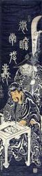 | Keywords: The Chinese General Guan Yu Sitting at a Small Table (5759421504).jpg en <b>Accession Number </b> 1957 70 <b>Display Artist </b> Nishimura Shigenaga <b>Display Title </b> The Chinese General Guan Yu Sitting at a Small Table <b>Creation Date </b> 1740-1750 <b>Medium </b> Woodblock <b>Height </b> 25 7/16 in <b>Width </b> 6 1/8 in <b>Display Dimensions </b> 25 7/16 in x 6 1/8 in 64 61 cm x 15 56 cm <b>Credit Line </b> Bequest of Mrs Cora Timken Burnett <b>Label Copy </b> Japanese audiences admired Guan Yu a hero of Chinas ancient past for his loyalty and superhuman strength He is said to have been so tough that he was able to continue playing the game of go while having a poisoned arrow removed from his back As an example of the Japanese penchant for clever or amusing substitutions the artist Shigenaga has placed a book on the low table in place of the game Another artist took the parody one step further by substituting a fashionably dressed woman for Guan Yu himself In both prints his grim-looking attendant holds his Green Dragon Crescent Blade <b>Collection </b> <a href http //www sdmart org/art/our-collection/asian-art rel nofollow >The San Diego Museum of Art</a> 2007-05-09 16 13 18 https //www flickr com/photos/thesandiegomuseumofartcollection/5759421504/ Flickr en thesandiegomuseumofartcollection PD-old-100 Files from the San Diego Museum of Art to be checked |