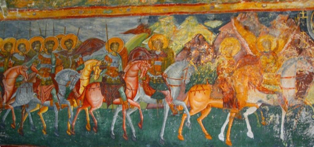 | Keywords: The church of the Holy Cross of Pătrăuţi 01.jpg Импе ато Константин со святыми вио нами следуют за а хангелом ихаилом Ф еска це кви святого К еста в Пэт эуци Румыния scan from tourist book end of XV c anonimus Frescos of Christian saints PD-Art |