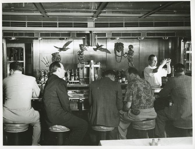 | Keywords: cocktail men man passenger liner passengerliner passenger passenger vessel passengervessel passengers leisure rms caronia rmscaronia Photograph of the cocktail bar onboard RMS CARONIA Sydney, Australia. Five men sit on stools along a bar, while a barman makes a cocktail in a shaker. An inscription on the reverse reads: `Cocktail bar on board RMS CARONIA Feb 1951.' The ANMM undertakes research and accepts public comments that enhance the information we hold about images in our collection. Photographer: Henry Gawthorpe Object no. 00018044 ANMM Collection Gift from Henry Gawthorpe Photograph of the cocktail bar onboard RMS CARONIA Sydney, Australia. Five men sit on stools along a bar, while a barman makes a cocktail in a shaker. An inscription on the reverse reads: `Cocktail bar on board RMS CARONIA Feb 1951.' The ANMM undertakes research and accepts public comments that enhance the information we hold about images in our collection. Photographer: Henry Gawthorpe Object no. 00018044 ANMM Collection Gift from Henry Gawthorpe |