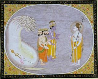 | Keywords: The Cosmic Ocean Reveals Brahma, Vishnu, and Shiva.jpg en The Cosmic Ocean Reveals Brahma Vishnu and Shiva a Mandi-style miniature c 1835 Source http //cgi www sandiegomuseum org/cgi-bin/www sandiegomuseum org/image pl mode painting 20943 axis 983839175 downloaded July 2001 The Cosmic Ocean Reveals Brahma Vishnu and Shiva Style of Sajnu Around 1835 North India Panjab Hills Mandi Opaque watercolor and gold on paper Edwin Binney 3rd Collection 1835 http //www columbia edu/itc/mealac/pritchett/00routesdata/1800_1899/hinduism/greatgods/greatgods html author PD-Art Uploaded with UploadWizard Trimurti |