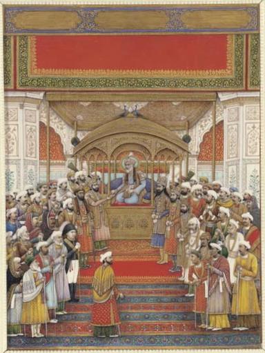 | Keywords: The Delhi Darbar of Akbar II.jpg  The Delhi Darbar of Akbar II r 1806-1837 India Mughal Delhi School Painted on ivory depicting Akbar II seated upon a peacock throne within a golden pavilion surrounded by courtiers including his sons the future Bahadur Shah and Mizra Jahangir and attended by the British Resident Sir David Ochterlony in a tricorn hat; with ivory frame carved in deep relief depicting vignettes of Hindu deities including Rama and Sita Vishnu Hanuman Shiva Saraswati Brahma and Parvati with Ganesha interspersed with scrollwork Image 14 5/8 x 10 7/8 in 37 1 x 27 7 cm ; with ivory frame 18¼ x 14½ in 46 4 x 36 8 cm http //www christies com/lotfinder/lot/the-delhi-darbar-of-akbar-ii-india-4346801-details aspx from searchresults pos 9 intObjectID 4346801 sid 73385964-d37d-463e-8a69-8094ff26045a page 1 century 19 author PD-art-100 1820s paintings from India Akbar II Durbar court Peacock Throne |