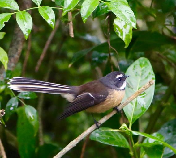 Keywords: birds fantails new zealand newzealand nature feathers outdoors animals insects leaf free brown outdoor animal bird Another of our Native favoured birds, this delightful sprightly bird, flitters quickly around bushes , looking for small insects , they will often follow walkers through forest tracks, awaiting for us to disturb the local insect populations so they can easily feed. The New Zealand fantail (Rhipidura fuliginosa) is a small insectivorous bird. A common fantail found in the South Island of New Zealand, also in the North Island as subspecies Rhipidura fuliginosa placabilis, the Chatham Islands as Rhipidura fuliginosa penita and formerly (now extinct) the Lord Howe Island as Rhipidura fuliginosa cervina. Also known as the pied fantail (pied morph only) or by its Maori name, Pīwakawaka or Tīwakawaka. The species is considered by many to be conspecific (the same) as the grey fantail of Australia and New Caledonia,[2] however due to differences in its calls some authorities now treat it as a separate species.[3] Another of our Native favoured birds, this delightful sprightly bird, flitters quickly around bushes , looking for small insects , they will often follow walkers through forest tracks, awaiting for us to disturb the local insect populations so they can easily feed. The New Zealand fantail (Rhipidura fuliginosa) is a small insectivorous bird. A common fantail found in the South Island of New Zealand, also in the North Island as subspecies Rhipidura fuliginosa placabilis, the Chatham Islands as Rhipidura fuliginosa penita and formerly (now extinct) the Lord Howe Island as Rhipidura fuliginosa cervina. Also known as the pied fantail (pied morph only) or by its Maori name, Pīwakawaka or Tīwakawaka. The species is considered by many to be conspecific (the same) as the grey fantail of Australia and New Caledonia,[2] however due to differences in its calls some authorities now treat it as a separate species.[3] |