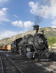 Keywords: The Durango & Silverton Narrow Gauge Railroad (D&SNG) is powered up and ready to leave the Durango, Colorado, station LCCN2015632655.tif 1 photograph digital tiff file color Notes The D SNG is a narrow-gauge railroad that operates 45 2 miles of track between Durango and Silverton in southwest Colorado The route was originally opened in 1882 by the Denver Rio Grande Railway to transport silver and gold ore mined from the San Juan Mountains The line has run continuously since 1881 and some rolling stock dates to then It is now strictly a tourist and heritage line hauling passengers and is one of the few places in the United States that has seen continuous use of steam locomotives In March 1981 the Denver Rio Grande Western sold the line and the D SNG was formed Trains operate from Durango just 26 miles into the mountains in winter months and the full 45 miles to Silverton during warmer months ; Purchase; Carol M Highsmith Photography Inc ; 2015; DLC/PP-2015 068 ; Forms part of Gates Frontiers Fund Colorado Collection within the Carol M Highsmith Archive ; Credit line Gates Frontiers Fund Colorado Collection within the Carol M Highsmith Archive Library of Congress Prints and Photographs Division ; Title date and keywords based on information provided by the photographer 2015 Creator Carol M Highsmith Library of Congress Catalog http //lccn loc gov/2015632655 Image download https //cdn loc gov/master/pnp/highsm/32600/32640a tif Original url http //hdl loc gov/loc pnp/highsm 32640 No known restrictions on publication LOC-image highsm 32640 37 23 9331 0 N 107 48 9072 0 W alt 0_source exif_heading PD-Highsmith Images uploaded by Fæ Gates Frontiers Fund Colorado Collection within the Carol M Highsmith Archive Durango and Silverton Narrow Gauge Railroad trains Gates Frontiers Fund Colorado Collection within the Carol M Highsmith Archive Library of Congress Prints and Photographs Division Photographs by Carol M Highsmith