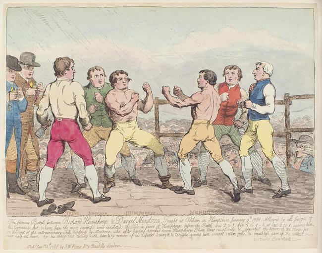 | Keywords: The famous battle between Richard Humphreys and Daniel Mendoza...' (Richard Humphries; Daniel Mendoza) by Samuel William Fores.jpg The famous battle between Richard Humphreys and Daniel Mendoza ' Richard Humphries; Daniel Mendoza by Samuel William Fores floruit 1841 published 1788 See source website for additional information This set of images was gathered by User Dcoetzee from the National Portrait Gallery London website using a special tool According to the NPG's website the work was published prior to 1859 and so the author is reasonably presumed dead by 1939 D12369 1788 Samuel William Fores floruit 1841 PD-old-100 National Portrait Gallery London Daniel Mendoza Boxing in art 1788 engravings |