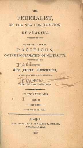 | Keywords: The Federalist (2nd ed, 1802, vol II title page).jpg Title page of cite book Publius pseudonym; w Alexander Hamilton ; John Jay ; James Madison The Federalist on the New Constitution Written in 1788 To which is Added Pacificus on the Proclamation of Neutrality Written in 1793 Likewise the Federal Constitution with all the Amendments 2nd New York N Y Printed and sold by George F Hopkins 1802 II 85799036 Scanned from an original copy 1802 Publius pseudonym; Alexander Hamilton 1755 01 11 or 1757 “ 1804 07 12 ; John Jay 1745 12 23 “ 1829 05 17 ; James Madison 1751 03 16 “ 1836 06 28 Other versions 100x100px The Federalist 2nd ed 1802 vol I title page jpg PD-old-100-1923 1802 books The Federalist Papers Title pages from the United States |