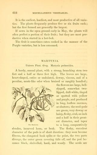 | Keywords: The field and garden vegetables of America (Page 612) (6002099421).jpg  612 <br> MISCELLANEOUS VEGETABLES <br> It is the earliest hardiest and most productive of all varie- <br> ties The plants frequently produce five or six fruits each ; <br> but the first formed are generally the largest <br> If sown in the open ground early in May the plants will <br> often perfect a portion of their fruit ; but they are most pro- <br> ductive when started in a hot-bed <br> The fruit is sometimes eaten cooked in the manner of the <br> Purple varieties but is less esteemed <br> MARTYNIA <br> Unicorn Plant Gray Martynia proboscidea <br> A hardy annual plant with a strong branching stem two <br> feet and a half or three feet high The leaves are large <br> heart-shaped entire or undulated doAvny viscous and of a <br> peculiar musk-like odor when bruised or roughly handled ; <br> the flowers are large bell- <br> shaped somewhat two- <br> lipped dull-white tinged <br> or spotted with yellow <br> and purple and produced <br> in long leafless racemes <br> or clusters ; the seed-pods <br> are green very downy or <br> hairy fleshy oval an inch <br> and a half in their great- <br> est diameter and taper <br> The Martynia tO a ldlg COllipa HI t \ Ay <br> slender incurved horn or beak The fleshy succulent <br> character of the pods is of short duration they soon become <br> fibrous the elongated beak splits at the point the two parts <br> diverge the outer green covering falls off and the pod be- <br> comes black shrivelled hard and woody The seeds are 29062950 92326 42073 Page 612 Text http //www biodiversitylibrary org/page/29062950 1863 10 5962/bhl title 42073 Burr Fearing NameFound Martynia NameConfirmed Martynia L EOLID 61735 NameFound Martynia proboscidea NameConfirmed Martynia proboscidea Gloxin EOLID 492400 NameBankID 617768 Biodiversity Heritage Library The field and garden vegetables of America United States Varieties Vegetable gardening Vegetables Library Congress bhl page 29062950 dc identifier http //biodiversitylibrary org/page/29062950 united states Information field Flickr posted date ISOdate 2011-08-02 CC-BY-2 0 BioDivLibrary https //flickr com/photos/61021753 N02/6002099421 2015-09-10 20 56 06 cc-by-2 0 PD-old-70-1923 The field and garden vegetables of America Photos uploaded from Flickr by Fæ using a script |