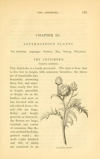 | Keywords: The field and garden vegetables of America (Page 149) (6002093625).jpg THE ARTICHOKE <br> 149 <br> CHAPTER III <br> ASPARAGINOUS PLANTS <br> The Artichoke Asparagus Cardoon Hop Oosung Phytolacca <br> THE ARTICHOKE <br> Cynarus scolymus <br> The Artichoke is a hardy perennial The stem is from four <br> to five feet in height with numerous branches ; the leaves <br> are of remarkable size <br> frequently measuring <br> three feet and some- <br> times nearly four feet <br> in length pinnatifid <br> or deeply cut on the <br> borders and more or <br> less invested with an <br> ash-colored down ; the <br> mid - ribs are large <br> fleshy and deeply <br> grooved or furrowed ; <br> the flowers are large <br> terminal and consist <br> of numerous blue flo- <br> rets enclosed by fleshy <br> pointed scales ; the <br> seeds eight hundred <br> and fifty of which <br> are contained in an <br> Green Globe Artichoke 29062487 92326 42073 Page 149 Text http //www biodiversitylibrary org/page/29062487 1863 10 5962/bhl title 42073 Burr Fearing NameFound Asparagus NameConfirmed Asparagus var pygmaeus Makino EOLID 10487111 NameFound Cynarus scolymus NameConfirmed Cynara scolymus EOLID 467499 NameBankID 2658448 NameFound Phytolacca NameConfirmed Phytolacca EOLID 39080 NameBankID 2576535 Biodiversity Heritage Library The field and garden vegetables of America United States Varieties Vegetable gardening Vegetables Library Congress bhl page 29062487 dc identifier http //biodiversitylibrary org/page/29062487 united states Information field Flickr posted date ISOdate 2011-08-02 CC-BY-2 0 BioDivLibrary https //flickr com/photos/61021753 N02/6002093625 2015-09-10 21 03 23 cc-by-2 0 PD-old-70-1923 The field and garden vegetables of America Photos uploaded from Flickr by Fæ using a script |