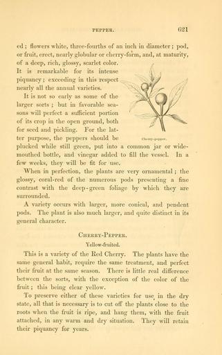 Keywords: The field and garden vegetables of America (Page 621) (6002647412).jpg PEPPER 621 <br> ed ; flowers white three-fourths of an inch in diameter ; pod <br> or fruit erect nearly globular or cherry-form and at maturity <br> of a deep rich glossy scarlet color <br> It is remarkable for its intense <br> piquancy ; exceeding in this respect <br> nearly all the annual varieties <br> It is not so early as some of the <br> larger sorts ; but in favorable sea- <br> sons will perfect a sufficient portion <br> of its crop in the open ground both <br> for seed and pickling For the lat- <br> ter purpose the peppers should be cherry-pepper <br> plucked while still green put into a common jar or wide- <br> mouthed bottle and vinegar added to fill the vessel In a <br> few weeks they will be fit for use <br> When in perfection the plants are very ornamental ; the <br> glossy coral-red of the numerous pods presenting a fine <br> contrast with the deep -green foliage by which they are <br> surrounded <br> A variety occurs with larger more conical and pendent <br> pods The plant is also much larger and quite distinct in its <br> general character <br> Cherry-Pepper <br> Yellow-fruited <br> This is a variety of the Red Cherry The plants have the <br> same general habit require the same treatment and perfect <br> their fruit at the same season There is little real difference <br> between the sorts with the exception of the color of the <br> fruit ; this being clear yellow <br> To preserve either of these varieties for use in the dry <br> state all that is necessary is to cut off the plants close to the <br> roots when the fruit is ripe and hang them with the fruit <br> attached in any warm and dry situation They will retain <br> their piquancy for years 29062959 92326 42073 Page 621 Text http //www biodiversitylibrary org/page/29062959 1863 10 5962/bhl title 42073 Burr Fearing Biodiversity Heritage Library The field and garden vegetables of America United States Varieties Vegetable gardening Vegetables Library Congress bhl page 29062959 dc identifier http //biodiversitylibrary org/page/29062959 united states Information field Flickr posted date ISOdate 2011-08-02 CC-BY-2 0 BioDivLibrary https //flickr com/photos/61021753 N02/6002647412 2015-09-10 21 02 13 cc-by-2 0 PD-old-70-1923 The field and garden vegetables of America Photos uploaded from Flickr by Fæ using a script |