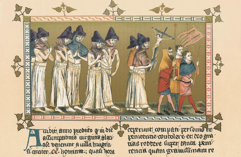 | Keywords: The flagellants at Doornik in 1349.jpg The flagellants at Doornik Tournai in 1349 From the caption <small>Printed by the Bibliographisches Institut Leipzig </small> THE FLAGELLLANTS AT DOORNIK IN 1349 <small>MINIATURE FROM THE CHRONICLE OF AEGIDIUS LI MUISIS IN THE LIBRARY AT BRUSSELS </small> <small> After Paul Fredericq De secten der Geeselaars en der Dansers in de Nederlanden tijdens de 14<sup>de</sup> eeuw </small> That source indicates that the portion of the Gothic-lettered Latin text from the original source is only partial They render the text as <blockquote>Accidit anno predicto quod in die assumptionis virginis gloriose venerunt a vill brugensi circiter CC homines quasi ora prandii Ipsi autem adunaverunt se i foro et statim rumor magnus fuit per totam civitatem unde omnes veniebant Catervatim venerunt ad locum supradictum quia super hoc rumores audeirant et idcirco factum videre affectabant Illi autem de Brugis interim se preparaverunt et ritum suum quam penitantiam vocabant facere inceperunt Pupulus autem utriusque sexus qui nunquam talk quid viderant ceperunt compati personis et penitentie condolore et deo gratias reddere super tanta penetencia quam gravissimam reputabant Remanseruntque dicti Brugenses in civitate tota illa die et nocte </blockquote> translated there as <blockquote>In the aforesaid year it came to pass that on the day of the Assumption of the Blessed Virgin Aug 15 some 200 persons came here from Bruges about noon These remained assembled on the market-place and immediately the whole town was filled with curiosity as to why these folk had come The burgesses came in small bodies to the market-place when the heard the news in order to convince them of the fact by their own eyes Meantime the folk from Bruges prepared to perform their cememonies which they called penance The inhabitants of both sexes who had never before seen any such thing began to imitate the actions of the strangers to torment themselves also by the penitential exercises and to thank God for this means of penance which seemed to them most effectual And the people from Bruges remained in the town the whole of that day and night </blockquote> H F Helmolt History of the World Volume VII Dodd Mead 1902 Plate between pages 178 and 179 1902 After Paul Fredericq Public Domain The World's History 1901-1907 Self-flagellation in art Religion in Belgium History of Tournai PD-US PD-old 14th-century illuminated manuscripts Self-flagellation in art Disease in medieval miniature 1349 Brussels Bibliothèque Royale manuscripts Bibliographisches Institut Medieval miniatures of religious worship |