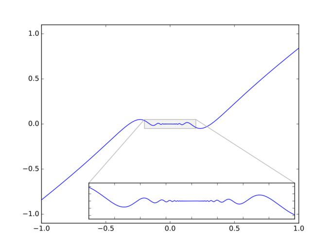 | Keywords: The function x^2*sin(1 over x).svg en Graph of the function <math>f \R\to\R x\mapsto\begin cases x 2\sin\left \frac 1x\right x \neq 0 \\ 0 x 0 \end cases </math> de Graph der Funktion <math>f \R\to\R x\mapsto\begin cases x 2\sin\left \frac 1x\right x \neq 0 \\ 0 x 0 \end cases </math> 2016-10-10 own http //kulla me Stephan Kulla User Stephan Kulla other versions <gallery> The function sin 1 over x svg Graph of function sin 1 over x The function x sin 1 over x svg Graph of function x sin 1 over x The function x 2 sin 1 over x svg Graph of function x 2 sin 1 over x </gallery> Other fields Matplotlib + import matplotlib pyplot as plt import numpy as np from mpl_toolkits axes_grid1 inset_locator import zoomed_inset_axes mark_inset xs1 np linspace -1 1 1 1 10002 xs2 1/ np arange 1 1001 1 np pi/2 xs np union1d np union1d xs1 xs2 -xs2 ys np sin 1/xs xs xs f ax plt subplots ax plot xs ys ax set_xlim -1 1 ax set_ylim -1 1 1 1 axins zoomed_inset_axes ax 4 loc 4 axins plot xs ys axins set_xlim -0 2 0 2 axins set_ylim -0 05 0 05 mark_inset ax axins loc1 2 loc2 1 fc 0 95 ec 0 7 plt xticks visible False plt yticks visible False plt savefig The function x 2 sin 1 over x svg cc-zero Differentiability functions Trigonometric functions |