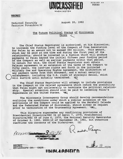 | Keywords: The Future Political Status of Micronesia Palau - NARA - 198207.tif Scope and content General notes 198207 Local identifier President 1981-1989 Reagan National Security Council 1981 - 1989 Ronald Reagan Library NLRR 40 Presidential Drive Simi Valley CA 93065-0600 1982-08-20 Record group Collection RR-NSC Numbered National Security Policy Papers 1981 - 1989 Record group ARC 1189 National Security Decision Directives compiled 02/25/1981 - 01/19/1989 Series ARC 198166 File unit File unit ARC Variant control numbers NAIL Control Number NLS-NSC-NSDD-52 yes Other versions <gallery> File The_Future_Political_Status_of_Micronesia_Palau_-_NARA_-_198207 tif tif File The_Future_Political_Status_of_Micronesia_Palau_-_NARA_-_198207 jpg jpg </gallery> NARA-cooperation PD-USGov Presidential Decision Directives Reagan NARA TIF images with categorized JPGs |
