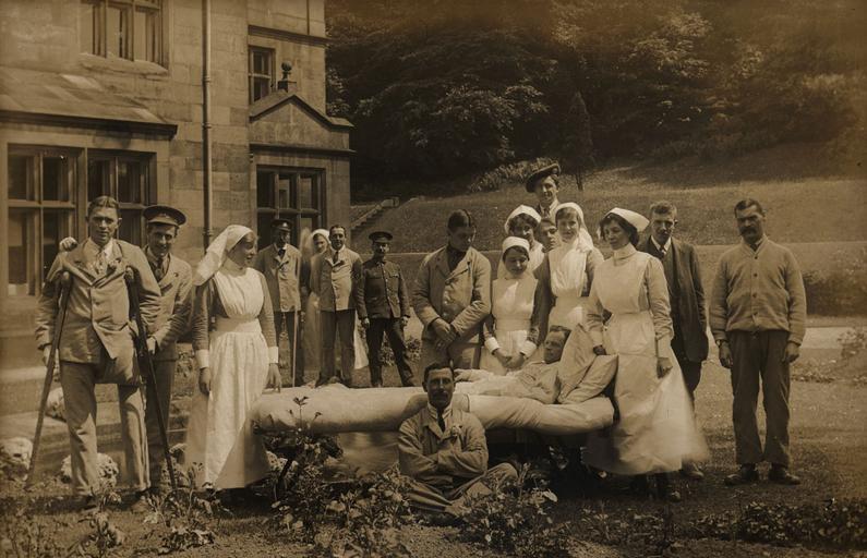 | Keywords: nurses soldiers first world war firstworldwar sepia photograph sepiaphotograph world war one worldwarone wounded soldier woundedsoldier garden social heritage socialheritage patients social history socialhistory monochrome outdoor surreal This is a photograph of nurses and patients at Longshaw Lodge Convalescent Home for Wounded Soldiers, Grindleford, near Sheffield.  Reference: DF.BGS-4-9-8  The photograph is part of a larger collection that offers a rare and intimate glimpse in to the Life of a Wounded Soldier recovering from the horrors of World War One.  This particular set of photographs is taken from a collection held at Tyne & Wear Archives capturing the every day lives of the nurses and patients at the 3rd Northern General Hospital, Sheffield and Longshaw Lodge Convalescent Home for Wounded Soldiers, Grindleford, near Sheffield. The photographs were taken between August 1916 and June 1917.  A blog about this fascinating collection can been viewed here on the Tyne & Wear Archives & Museums website.  (Copyright) We're happy for you to share these digital images within the spirit of The Commons. Please cite 'Tyne & Wear Archives & Museums' when reusing. Certain restrictions on high quality reproductions and commercial use of the original physical version apply though; if you're unsure please email archives@twmuseums.org.uk  This is a photograph of nurses and patients at Longshaw Lodge Convalescent Home for Wounded Soldiers, Grindleford, near Sheffield.  Reference: DF.BGS-4-9-8  The photograph is part of a larger collection that offers a rare and intimate glimpse in to the Life of a Wounded Soldier recovering from the horrors of World War One.  This particular set of photographs is taken from a collection held at Tyne & Wear Archives capturing the every day lives of the nurses and patients at the 3rd Northern General Hospital, Sheffield and Longshaw Lodge Convalescent Home for Wounded Soldiers, Grindleford, near Sheffield. The photographs were taken between August 1916 and June 1917.  A blog about this fascinating collection can been viewed here on the Tyne & Wear Archives & Museums website.  (Copyright) We're happy for you to share these digital images within the spirit of The Commons. Please cite 'Tyne & Wear Archives & Museums' when reusing. Certain restrictions on high quality reproductions and commercial use of the original physical version apply though; if you're unsure please email archives@twmuseums.org.uk |