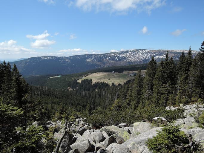 Keywords: the giant mountains mountains hills stones spruces trees view panorama landscape output hiker tourism mountain panorama solitude rest treking combs nature path forest tour
