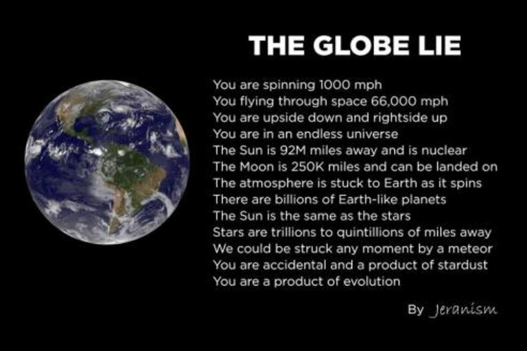 Keywords: lie atmoshpere flatearth flat earth space hoax sun moon yin yang yinyang god reality plane universe curve curvature nocurve bible truth dome black background The Globe Lie. You are spinning 1000mph. You flying through space 66,000mph. You are upside down and right-side up. You are in an endless universe. The Sun is 92m miles away and is nuclear. The Moon is 250k miles and can be landed on. The atmosphere is stuck to earth as it spins. There are billions of Earth-like planets. The Sun is the same as the stars. Stars are trillions to quintillions of miles away. We could be stuck any moment by a meteor. You are accidental and a product of stardust. You are a product of evolution. FlatEarth meme collected by A.J. Wilson of iPressThis at FlatEarth.Online, made by others. Credit to Jeranism. The Globe Lie. You are spinning 1000mph. You flying through space 66,000mph. You are upside down and right-side up. You are in an endless universe. The Sun is 92m miles away and is nuclear. The Moon is 250k miles and can be landed on. The atmosphere is stuck to earth as it spins. There are billions of Earth-like planets. The Sun is the same as the stars. Stars are trillions to quintillions of miles away. We could be stuck any moment by a meteor. You are accidental and a product of stardust. You are a product of evolution. FlatEarth meme collected by A.J. Wilson of iPressThis at FlatEarth.Online, made by others. Credit to Jeranism. |