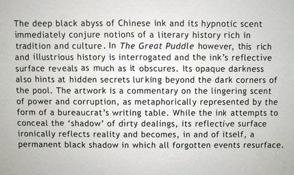 | Keywords: the great puddle by nguyen huy an text document writing blackandwhite black and white The Great Puddle 2009 Chinese ink and plywood The deep black abyss of Chinese ink and its hypnotic scent immediately conjure notions of a literary history rich in tradition and culture. In The Great Puddle however, this rich and illustrious history is interrogated and the ink's reflective surface reveals as much as it obscures. Its opaque darkness also hints at hidden secrets lurking beyond the dark corners of the pool. The artwork is a commentary on the lingering scent of power and corruption, as metaphorically represented by the form of a bureaucrat's writing table. While the ink attempts to conceal the 'shadow' of dirty dealings, its reflective surface ironically reflects reality and becomes, in and of itself, a permanent black shadow in which all forgotten events resurface. www.singaporebiennale.org/artist_nguyen_huy_an.html The Great Puddle 2009 Chinese ink and plywood The deep black abyss of Chinese ink and its hypnotic scent immediately conjure notions of a literary history rich in tradition and culture. In The Great Puddle however, this rich and illustrious history is interrogated and the ink's reflective surface reveals as much as it obscures. Its opaque darkness also hints at hidden secrets lurking beyond the dark corners of the pool. The artwork is a commentary on the lingering scent of power and corruption, as metaphorically represented by the form of a bureaucrat's writing table. While the ink attempts to conceal the 'shadow' of dirty dealings, its reflective surface ironically reflects reality and becomes, in and of itself, a permanent black shadow in which all forgotten events resurface. www.singaporebiennale.org/artist_nguyen_huy_an.html |