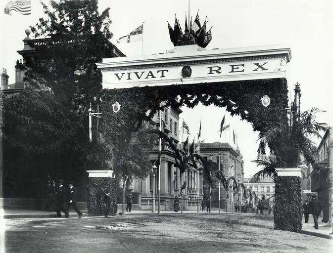 View Original:'The_King's_Avenue',_Bligh_Street,_Sydney_(NSW),_decorated_for_the_visit_of_the_Duke_and_Duchess_of_Cornwall_and_York..jpg (876x666)