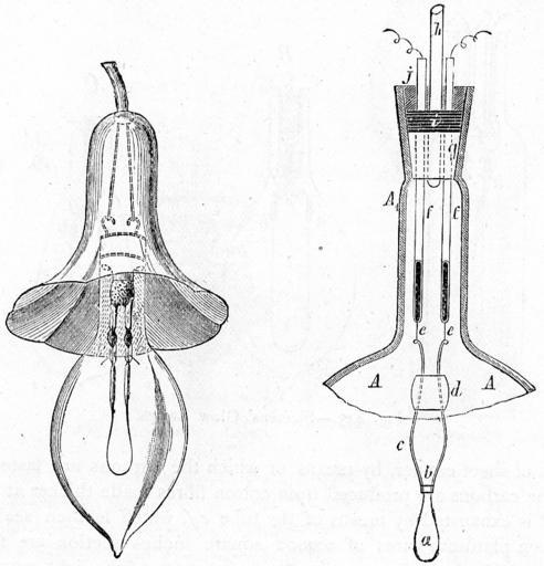 | Keywords: The Lane-Fox lamp.jpg en Two wires e e which are connected with the mercury tubes f are attached to the metal springs c which are the carbon holders These springs are regulated by the slide d consisting of insulating material The tubes f and h pass through an india-rubber cork g; i is a layer of mercury and over it is a layer of cement j The glass vessel is exhausted by means of the tube h Lane-Fox prepared the carbon filaments for his lamps in the following manner Hemp threads were wound round a piece of coke having a knife-edge at one side; and the whole placed in an oven During carbonisation the threads contracted and were cut by the knife-edge In this manner carbons of the same length were obtained Benzole or similar vapour was used for carbonising the filaments whilst the carbons were made white-hot by means of electric current The ends of the filaments were connected with a short piece of wire short-circuited and again a current passed through them The lamp was constructed in different sizes and for example for an intensity of 87 candles 66 volts and 0 673 ampere were required 1886 Fig 444 at http //archive org/stream/electricityinse02wormgoog page/n503/mode/1up page 465 in Electricity in the service of man by Alfred Ritter von Urbanitzky edited with copious additions by Richard Wormell Published by Cassell Company 1886 Unknown illustrator PD-old-100 Early incandescent light bulbs Scans from 'Electricity in the service of man' 1886 |
