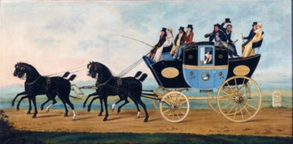 Keywords: The London to Birmingham Stage Coach, 1801.jpg 'The London to Birmingham Stage Coach' 1801 Oil painting by John Cordrey active 1799-1822 showing a stage coach with a full complement of pasengers including a wedding party The coach was made by William Thomas Co and is plying a route between London and Birmingham with stops at Coventry and Dunchurch Warwickshire A milestone on the right shows that the coach is eight miles from London Cordrey specialised in painting the network of coach services and improved road travel in the 19th century which provided healthy competition to the early railways http //www ssplprints com/image php id 87194 idx 1 fromsearch true Science and Society Picture Library 1801 John Cordrey PD-old-100 Stagecoaches in the United Kingdom in art Files uploaded by Darwinius Marriage in art 1801 in England 1801 in transport |