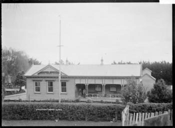 Keywords: blackandwhite monochrome outdoor photo border building architecture black and white The Men's Home (District Homes), Thames. A single storey wooden building surrounded by a formal garden and with a flag pole at the front. `The Men's Home' is written across the front. Two elderly men are standing on the front verandah. The Women's Home is situated next door across a driveway in the same grounds (to the left). Photograph taken by William A Price in early 1900s. Inscriptions: Inscribed - Photographer's title on negative -bottom left: Men's Home. Thames. 1408D. Quantity: 1 b&w original negative(s). Physical Description: Dry plate glass negative 4.75 x 6.5 inches The Men's Home, Thames. Price, William Archer, 1866-1948 :Collection of post card negatives. Ref: 1/2-001552-G. Alexander Turnbull Library, Wellington, New Zealand. natlib.govt.nz/records/23051857 The Men's Home (District Homes), Thames. A single storey wooden building surrounded by a formal garden and with a flag pole at the front. `The Men's Home' is written across the front. Two elderly men are standing on the front verandah. The Women's Home is situated next door across a driveway in the same grounds (to the left). Photograph taken by William A Price in early 1900s. Inscriptions: Inscribed - Photographer's title on negative -bottom left: Men's Home. Thames. 1408D. Quantity: 1 b&w original negative(s). Physical Description: Dry plate glass negative 4.75 x 6.5 inches The Men's Home, Thames. Price, William Archer, 1866-1948 :Collection of post card negatives. Ref: 1/2-001552-G. Alexander Turnbull Library, Wellington, New Zealand. natlib.govt.nz/records/23051857