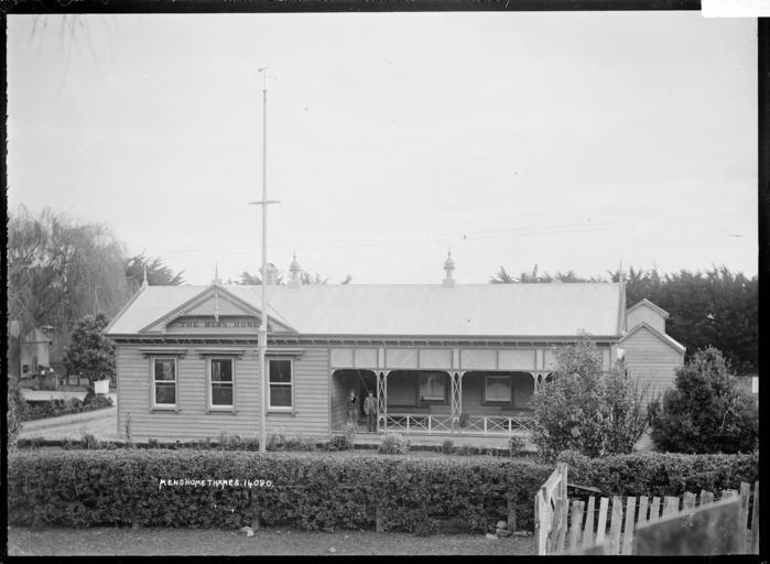 MAKE A MEME View Large Image The Men's Home (District Homes), Thames. A single storey wooden building surrounded by a formal garden and with a flag pole at the front. `The Men's Home' is written across the front. Two elderly men are standing on the front verandah. The ...