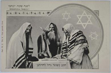 | Keywords: The National Library of Israel, Jewish New Year cards C AH 033.JPG ברכות שונה טובה http //web nli org il/sites/NLI/Hebrew/Pages/ContactUS aspx ברכות שנה טובה Jewish New Year cards כרטיס ברכה כבוד ראש השנה ובראשו הברכה ' שנה טובה תכתבו' הג ויה משנת 1904 מתארת תקיעת שופר בבית הכנסת ונראי בה ש ושה אנשי - התוקע ושופר בפיו המקריא את התקיעות ואד נוסף או י החזן עומדי סביב במה הש חן ע יו מניחי את ספרי התורה בעת קריאה בתורה המכוסה במפה וע יה כתוב תקע בשופר גדו חרותנו ברקע נראי ש ושה מגיני דוד Collections of the National Library of Israel 2012-08-15 13 38 54 PD-old Jewish New Year cards |