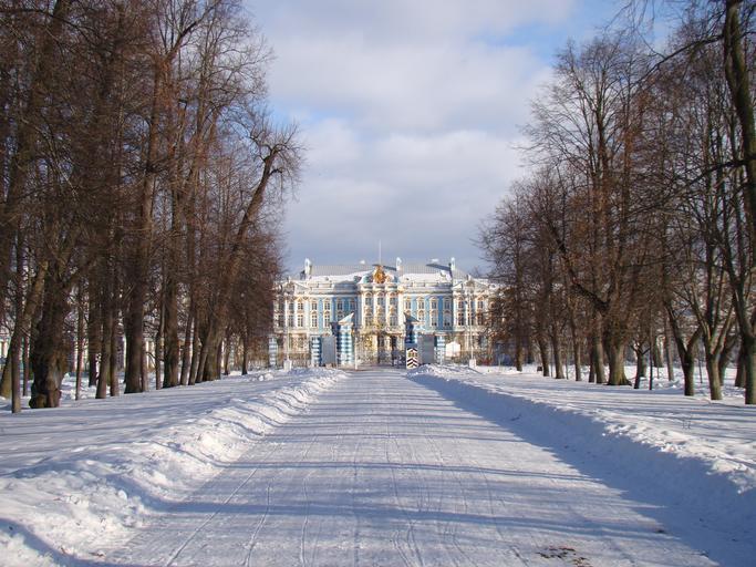 Keywords: the palace ensemble tsarskoe selo russia alley trees palace road snow winter shadow